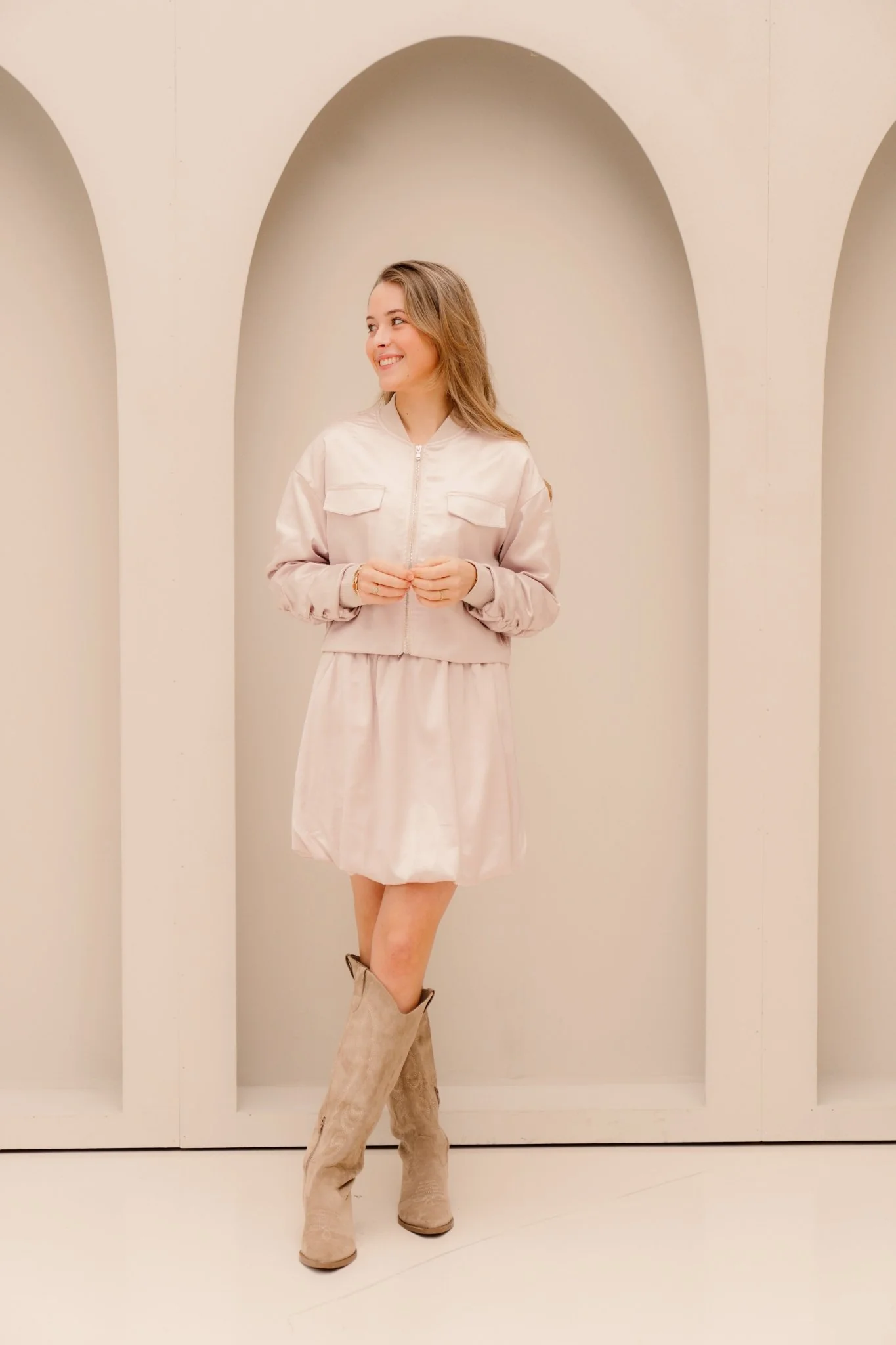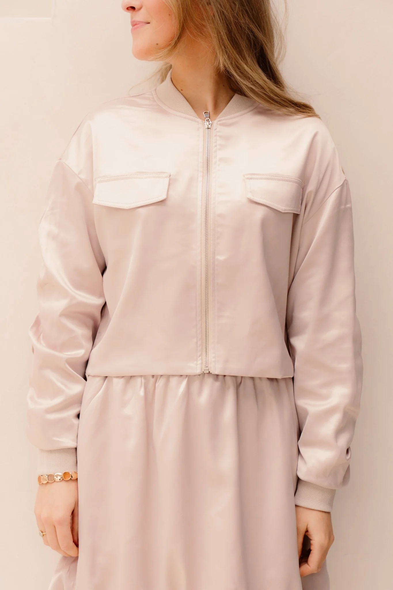 Deze beige jacket is gemaakt van een subtiel glinsterend stofje dat zorgt voor een elegante en verfijnde uitstraling. De lichte shimmer geeft het jasje net dat beetje extra, perfect voor zowel een feestelijke als een stijlvolle dagelijkse look. Bovendien is het verkrijgbaar met een bijpassend rokje.